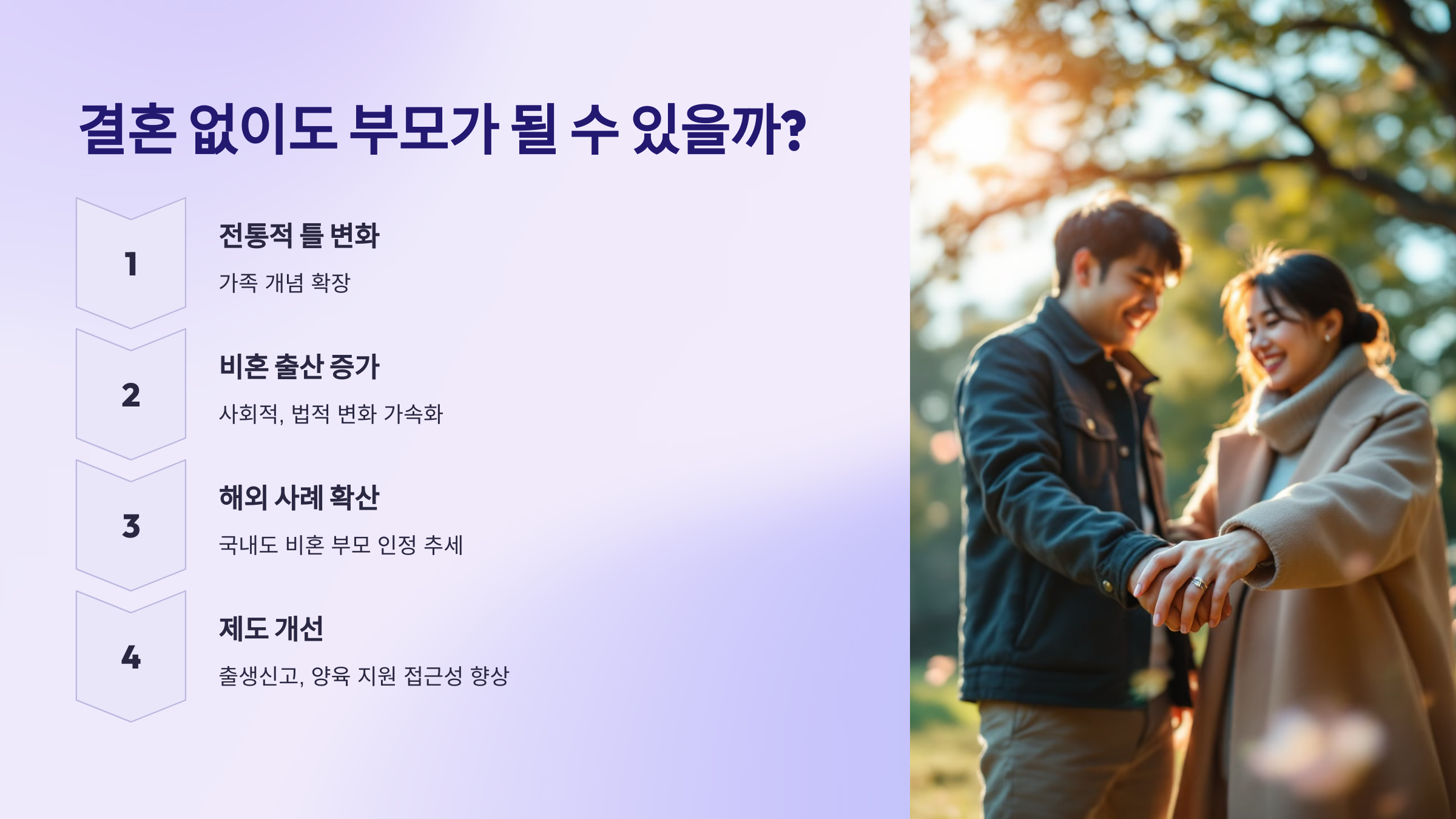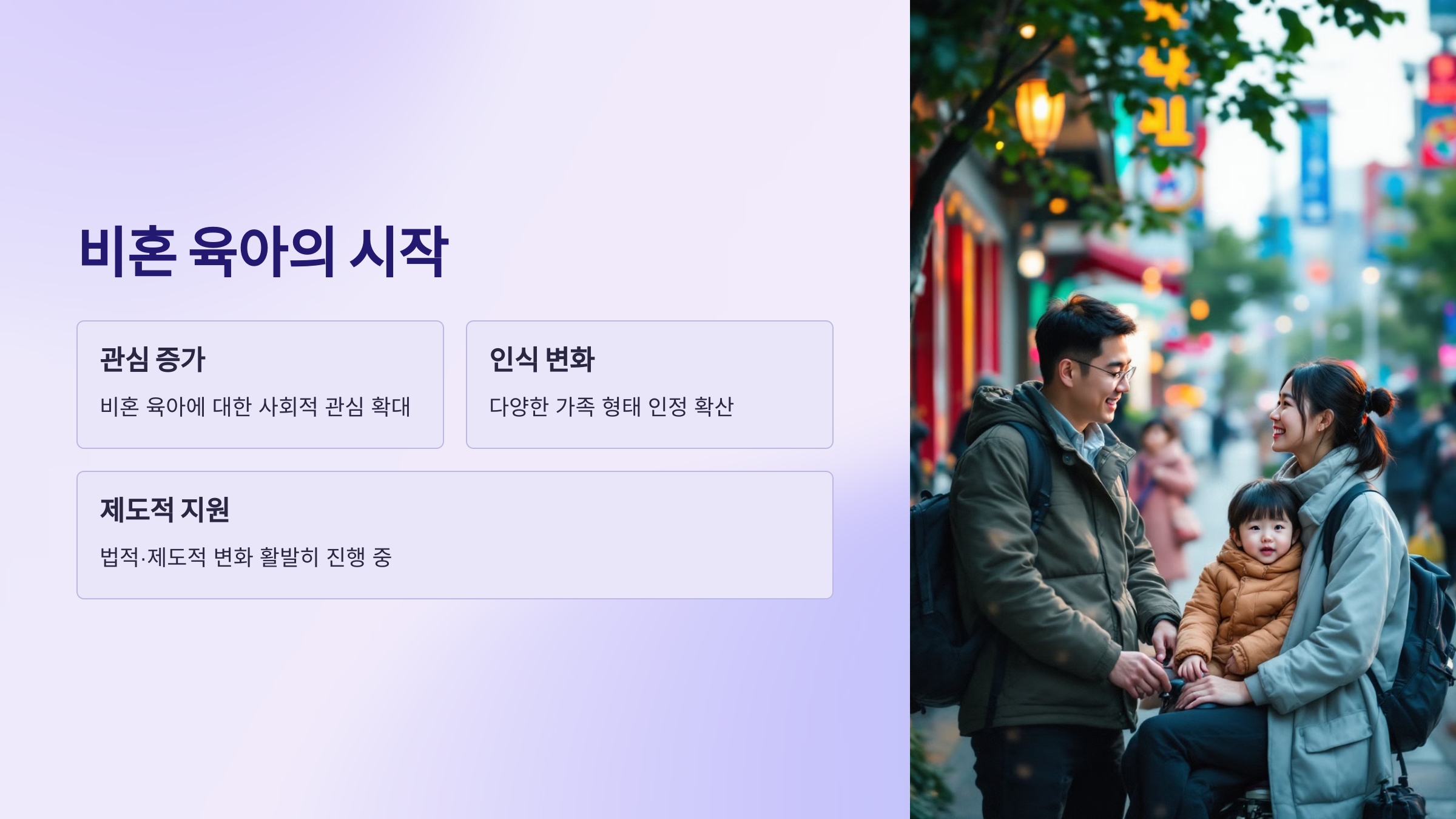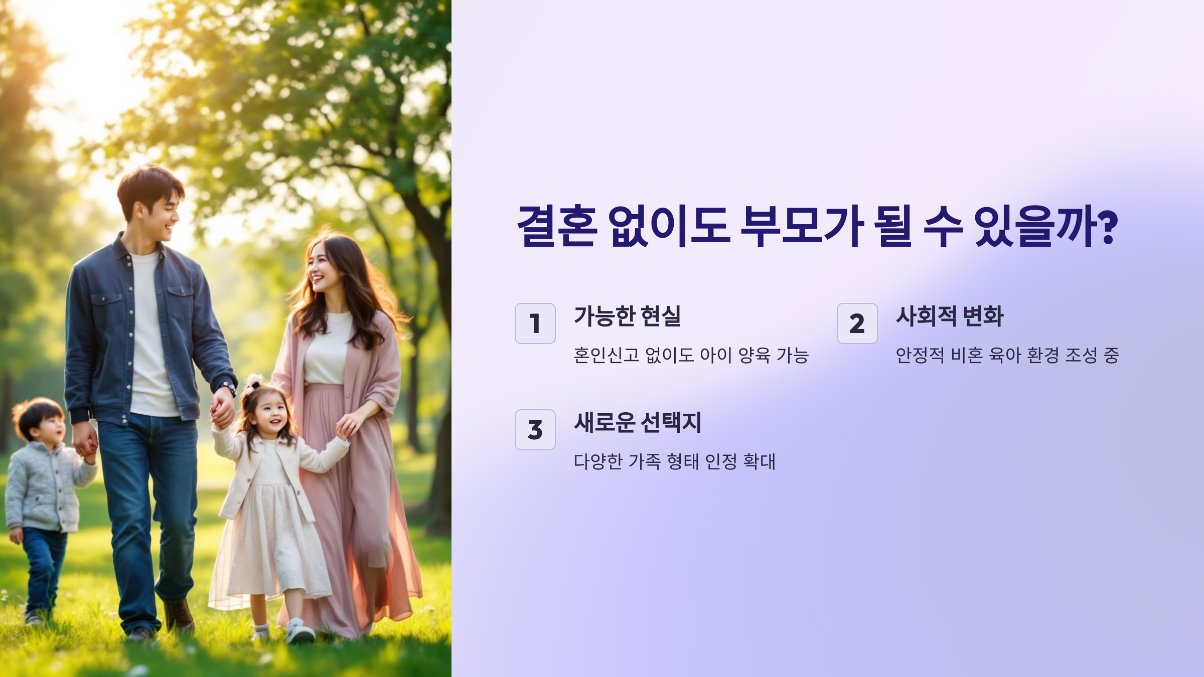 결혼 여부와 상관없이 부모가 될 수 있고, 비혼 부모도 충분히 안정적인 환경에서 아이를 키울 수 있는 사회적 변화가 이루어지고 있습니다.