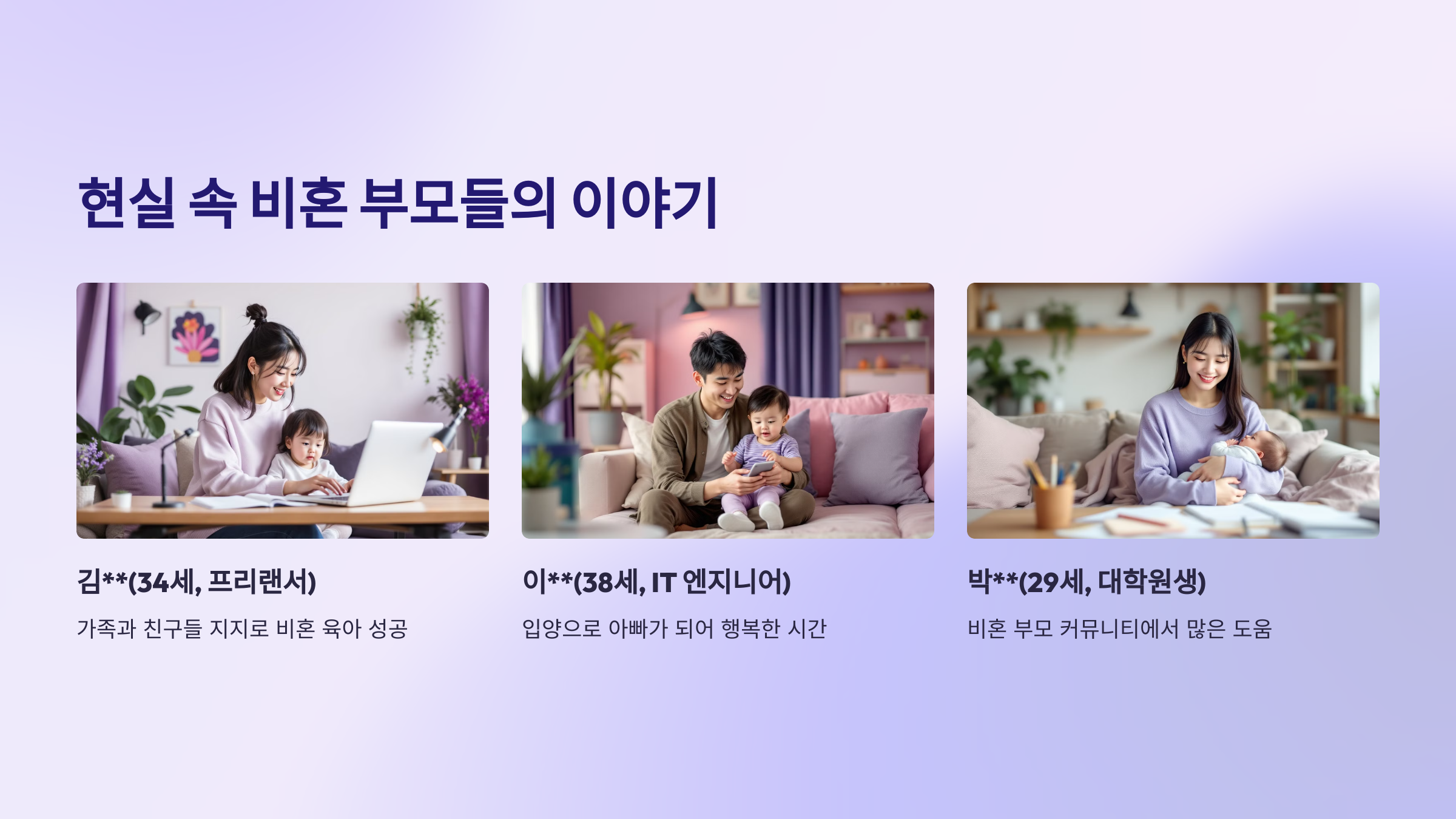 - 박**(29세, 대학원생): “혼자 육아하는 게 힘들 줄 알았는데, 비혼 부모 커뮤니티에서 많은 도움을 받고 있어요.”