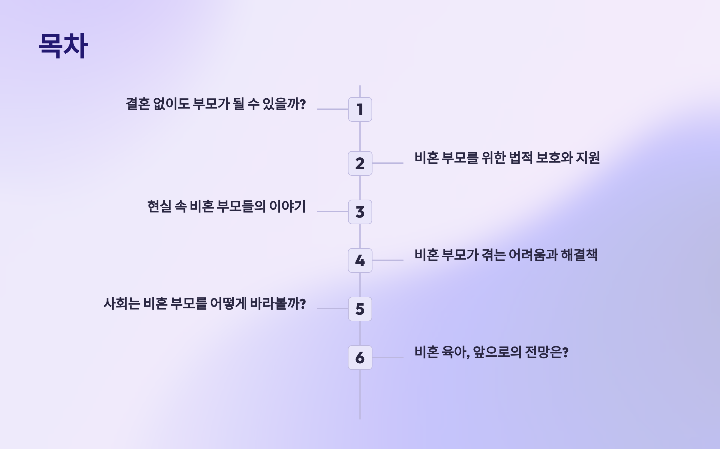 1. 결혼 없이도 부모가 될 수 있을까? 2. 비혼 부모를 위한 법적 보호와 지원 3. 현실 속 비혼 부모들의 이야기 4. 비혼 부모가 겪는 어려움과 해결책 5. 사회는 비혼 부모를 어떻게 바라볼까? 6. 비혼 육아, 앞으로의 전망은?