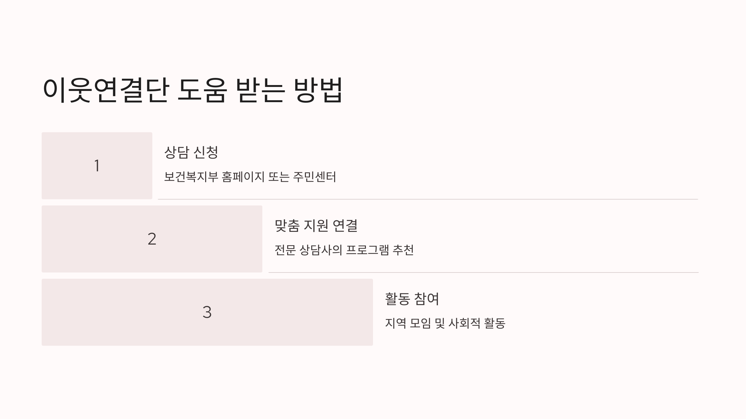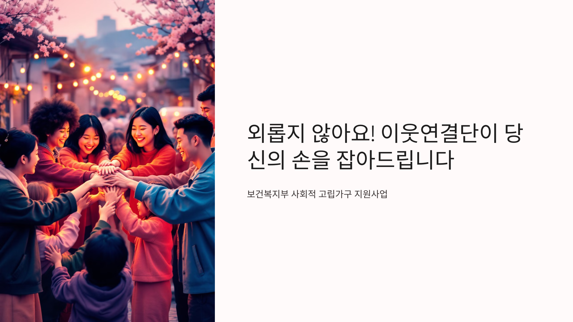 보건복지부의 사회적 고립가구 지원사업과 이웃연결단이 여러분과 함께할 준비가 되어 있습니다. 사회적 관계 단절로 어려움을 겪는 분들이 다시 따뜻한 공동체 속에서 살아갈 수 있도록 돕는
