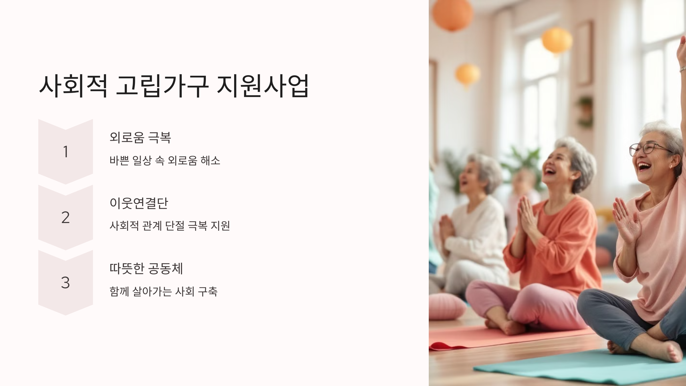 - 고립가구 맞춤형 지원: 심리 상담 및 생활 서비스 연계