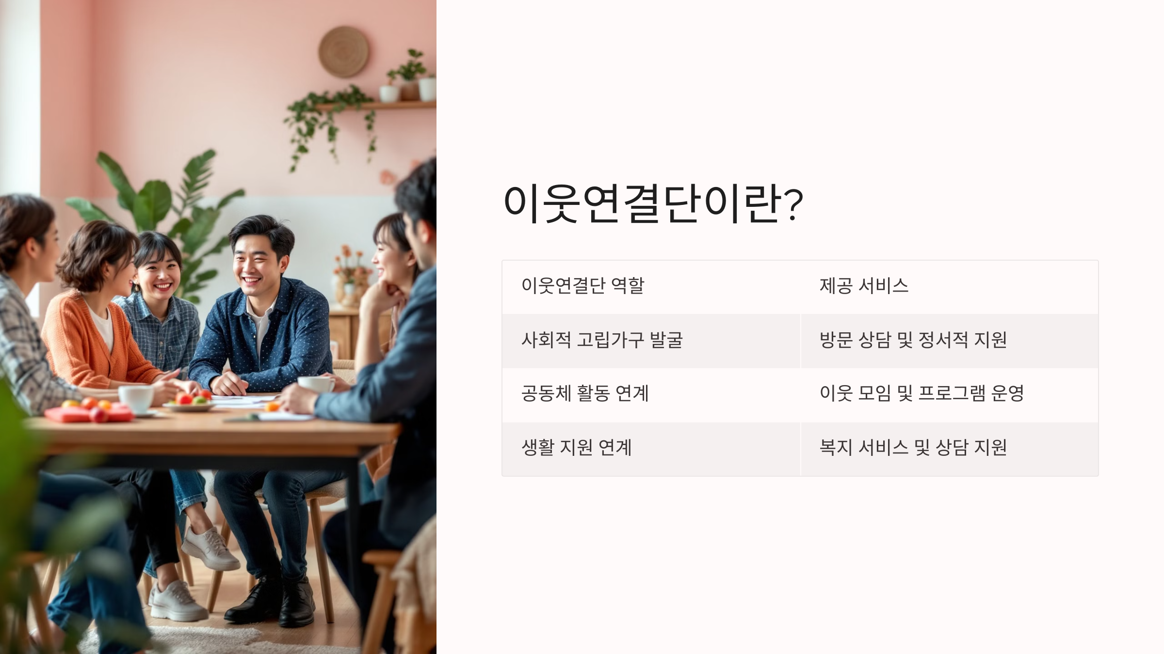 이웃연결단은 사회적 고립가구를 돕기 위해 만들어진 지역 기반 지원 네트워크입니다. 여러분이 혼자라고 느낄 때, 이웃연결단은 따뜻한 손길을 내밀어 도움을 제공합니다.
