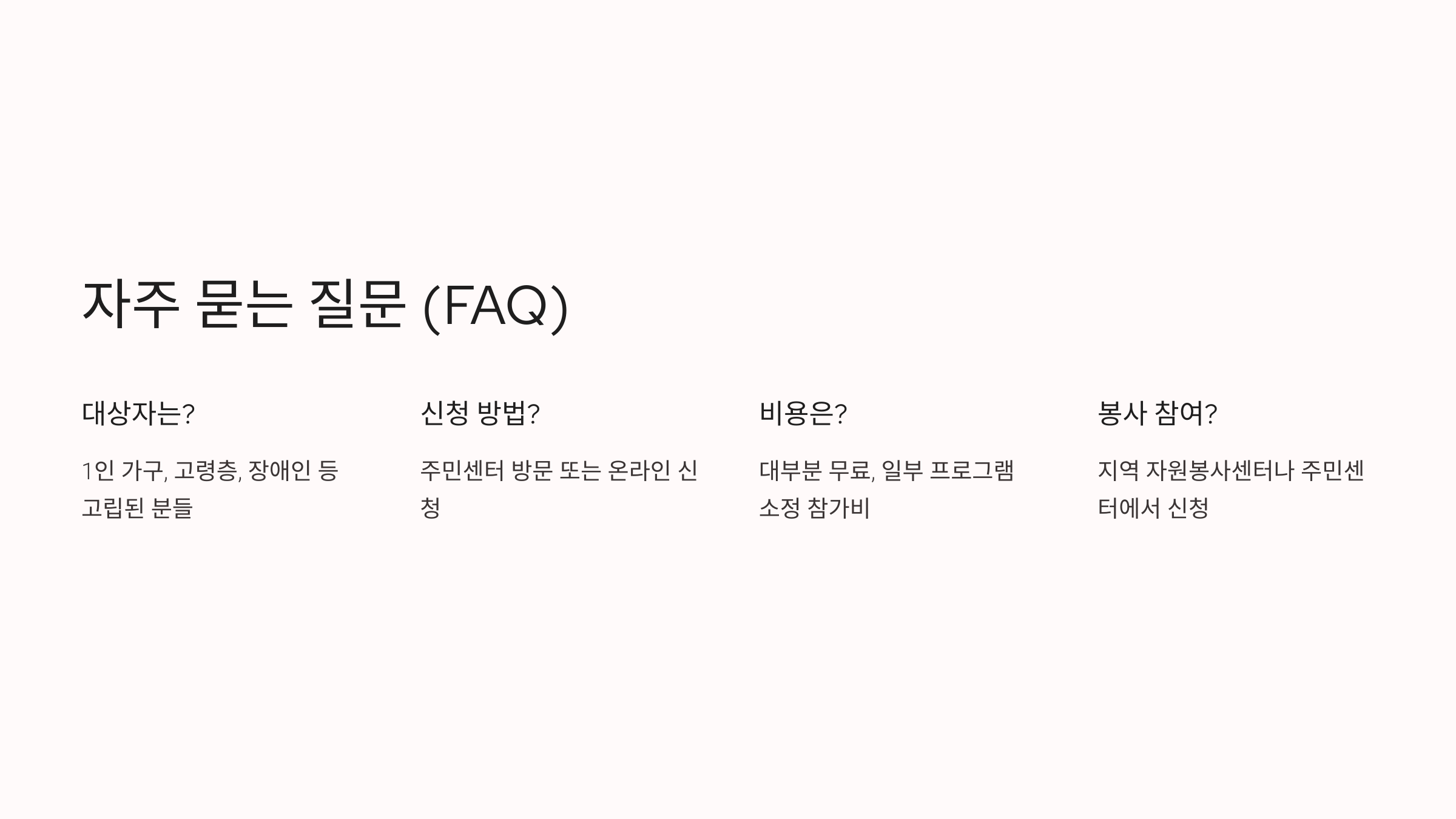 | 사회적 고립가구 발굴 | 방문 상담 및 정서적 지원 |