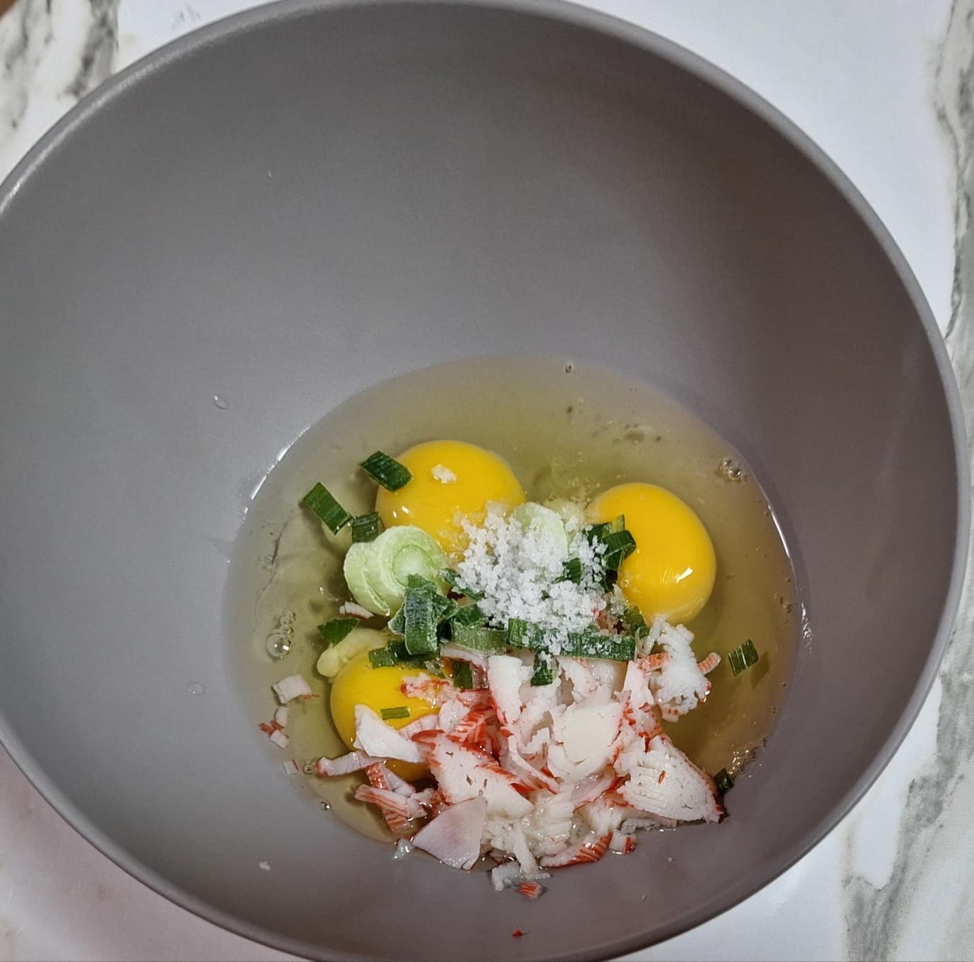 계란과 킹크랩,파 조금,소금만 들어간 이미지입니다. 아직 물을 붓진 않았어요.이제 물을 붓고 저어줄거에요.