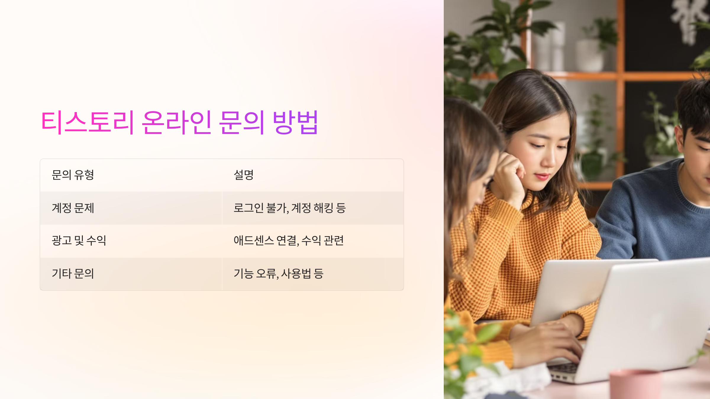 티스토리 관련 문제를 해결하려면 카카오 고객센터의 온라인 문의를 활용하면 됩니다. 아래의 표를 참고하여 자신에게 맞는 문의 유형을 선택하세요.