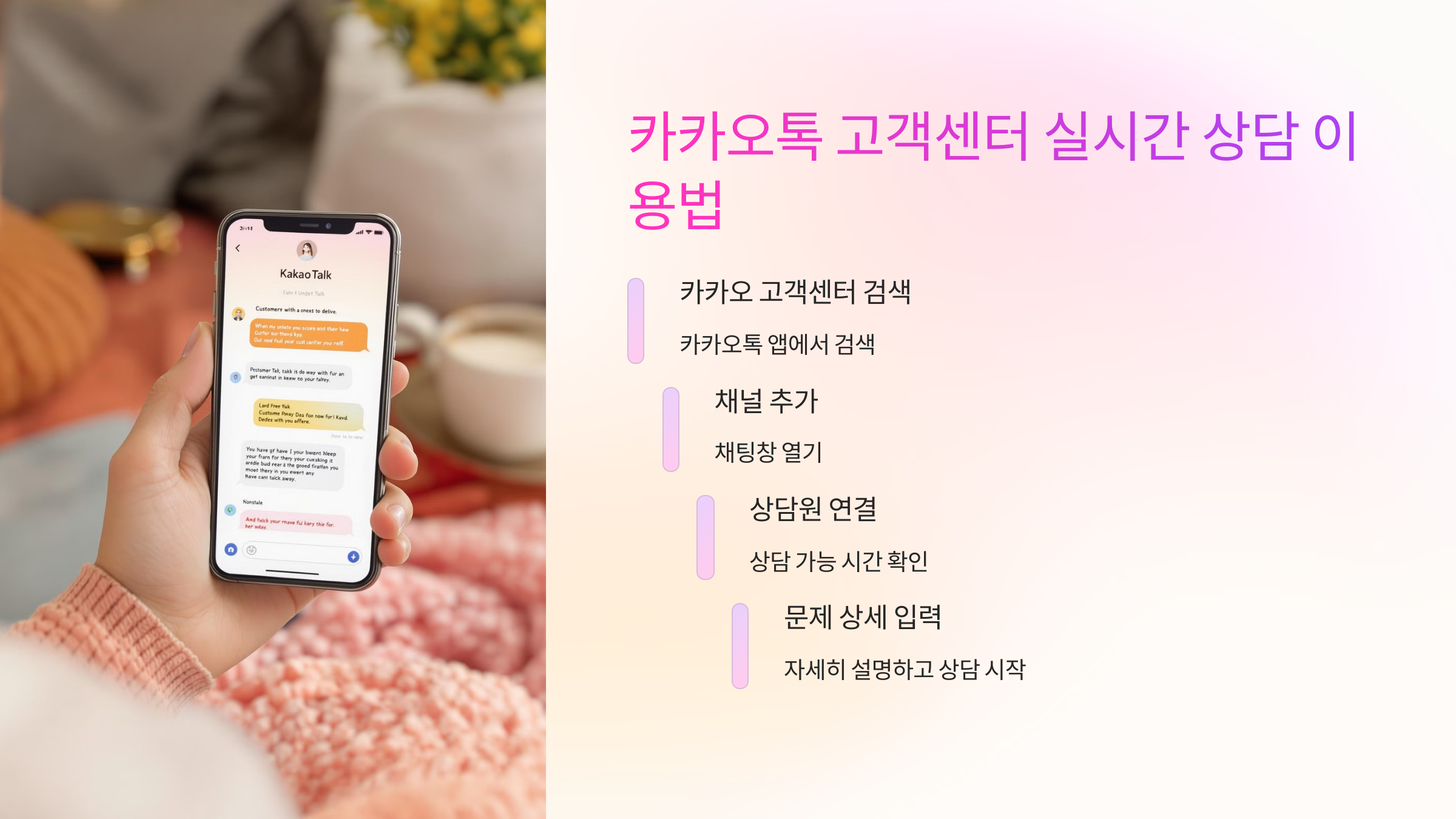 카카오톡 고객센터를 통해 실시간 상담을 받을 수도 있습니다. 절차는 간단합니다! 아래 단계를 따라 해보세요. 📲