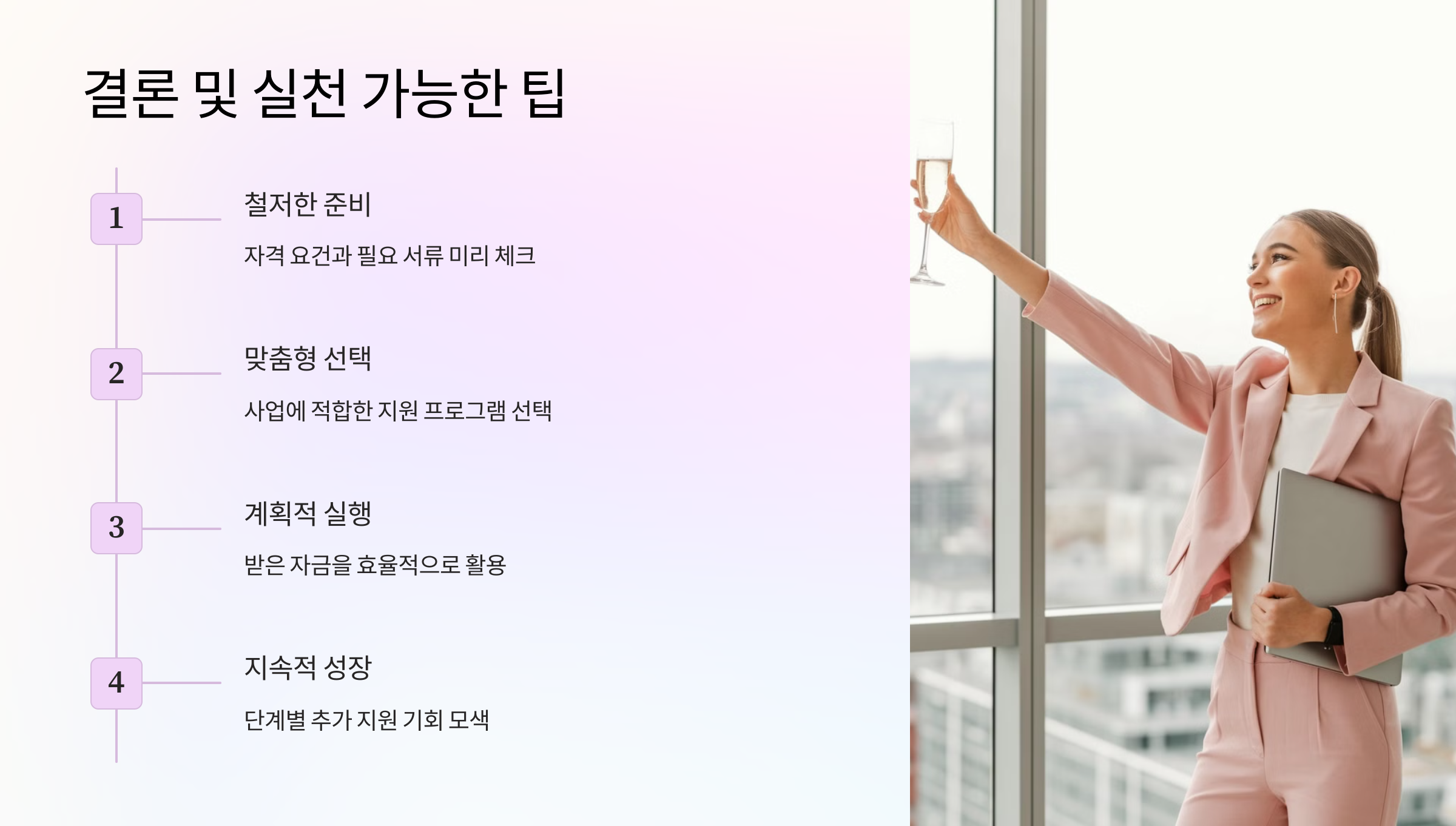 창업 희망자는 먼저 자신의 상황과 사업 계획에 적합한 지원 프로그램을 조사하고, 해당 프로그램의 자격 요건을 확인하는 것이 좋습니다. 또한, 지원금 신청 시 요구되는 사업 계획서는 사업의 비전과 실현 가능성을 명확히 보여줄 수 있도록 작성하는 것이 중요할 수 있습니다.
