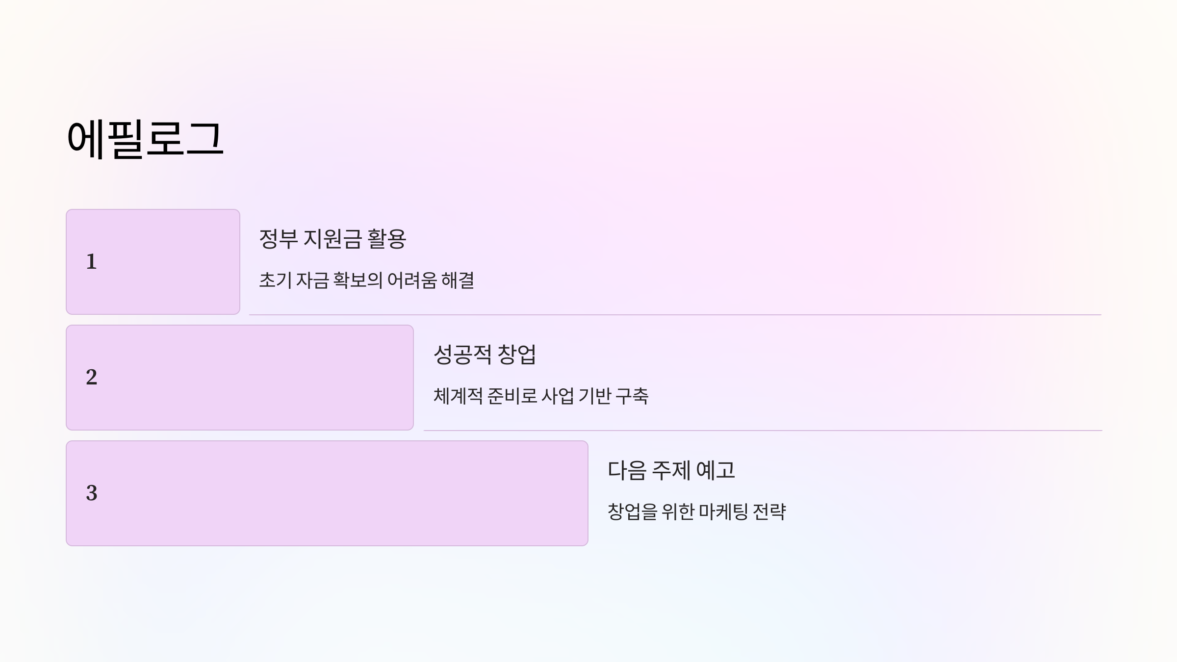 창업 과정에는 다양한 도전과 어려움이 따를 수 있으나, 정부 지원 프로그램은 이러한 과정에서 일정 부분 도움을 제공할 수 있습니다.