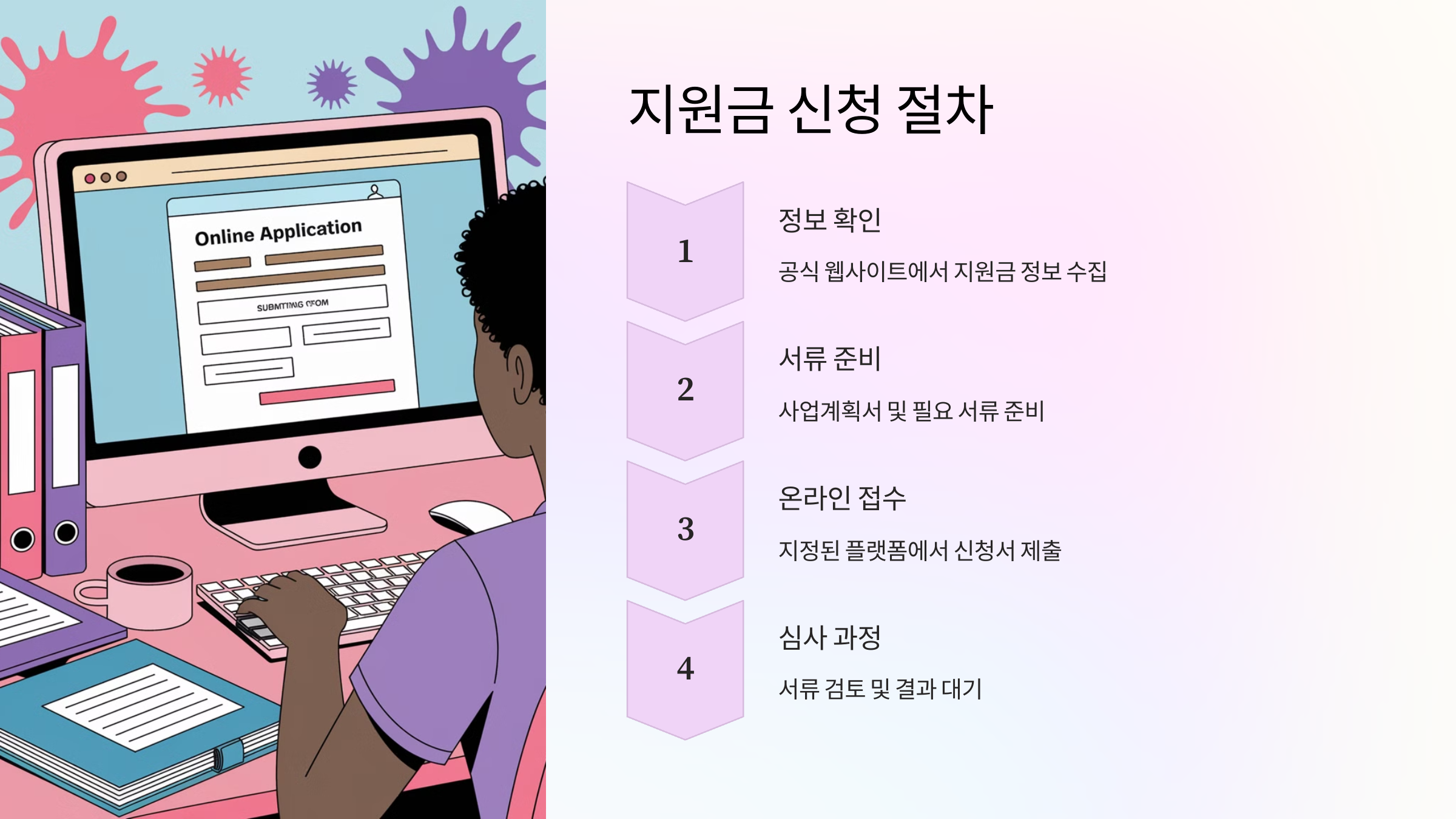 신청 절차와 필요 서류는 각 지원 프로그램마다 다를 수 있으므로, 관련 기관의 안내를 참고하는 것이 도움이 될 수 있습니다. 지원금을 받게 된 경우, 사업 계획에 따라 자금을 효율적으로 활용하는 것이 사업 성장에 기여할 수 있습니다.
