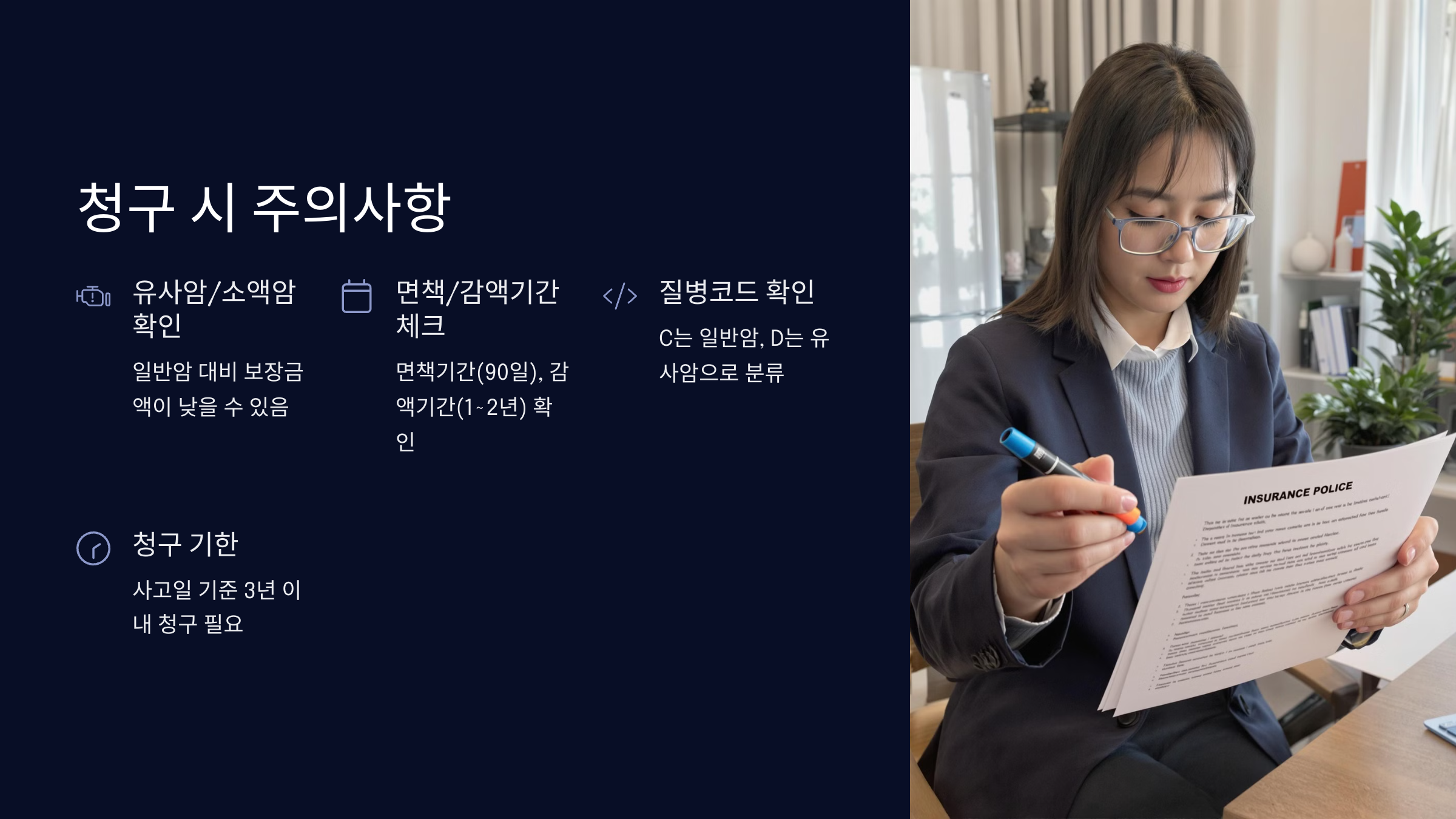 - 질병코드 C는 일반암, D는 유사암으로 분류되므로 진단서 코드 확인 필수