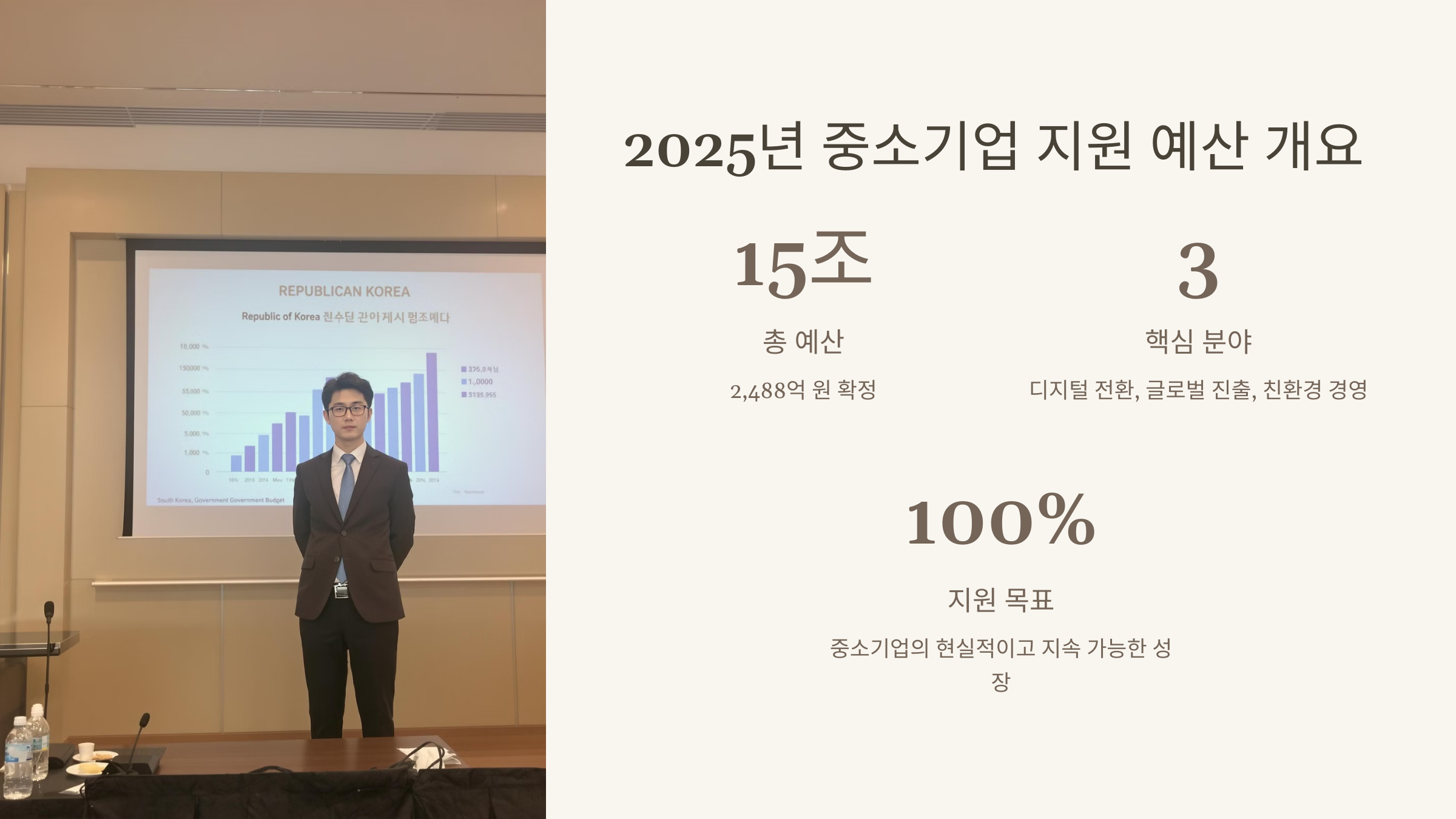 중소벤처기업부 공식 발표에 따르면, 2025년 예산이 15조 2,488억 원으로 책정되었다고 합니다. 이 예산을 통해 다양한 중소기업 지원 프로그램이 운영될 예정입니다.