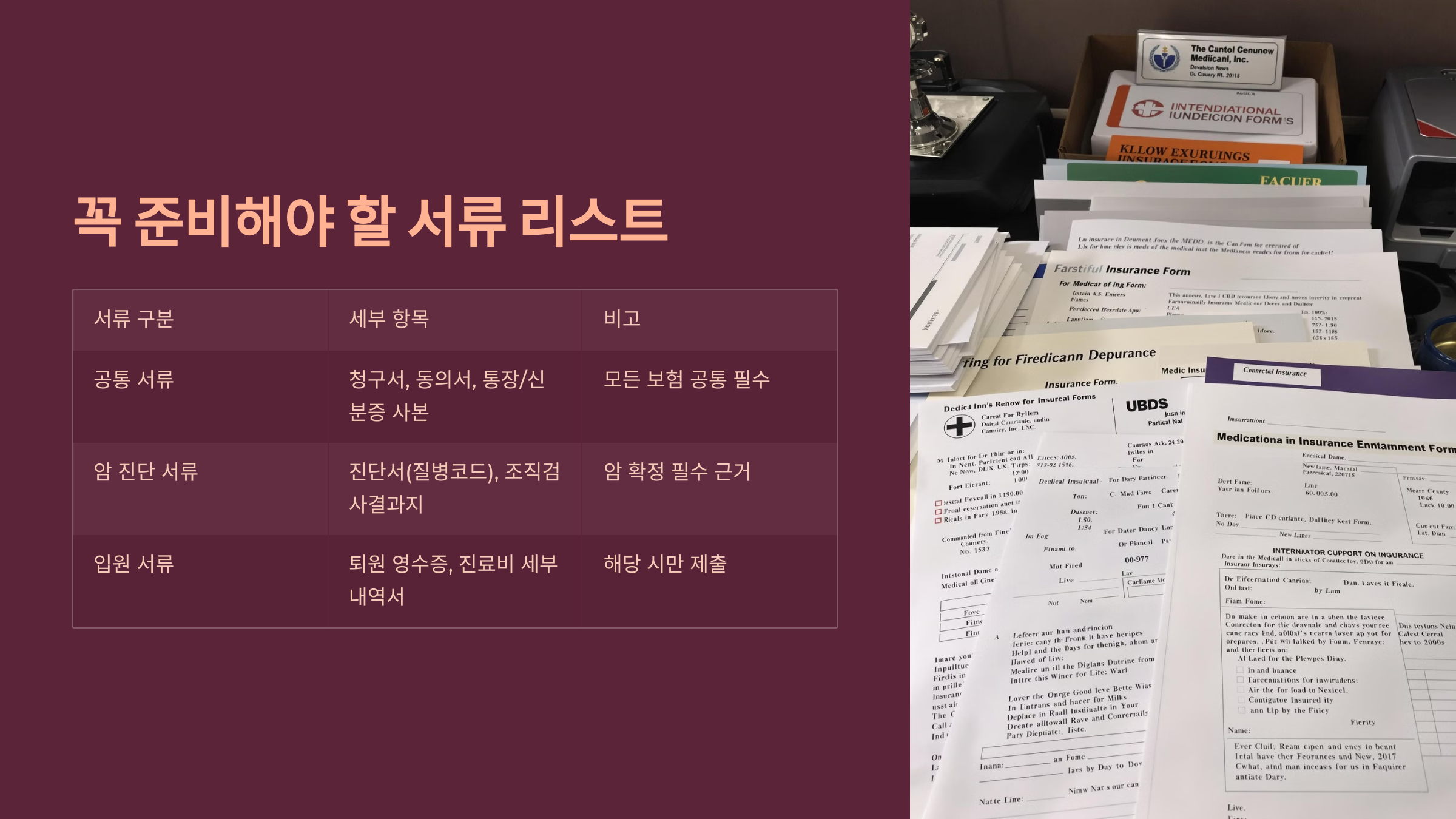 | 암 진단 서류 | 진단서(질병코드 포함), 조직검사결과지 | 암 확정 필수 근거 |