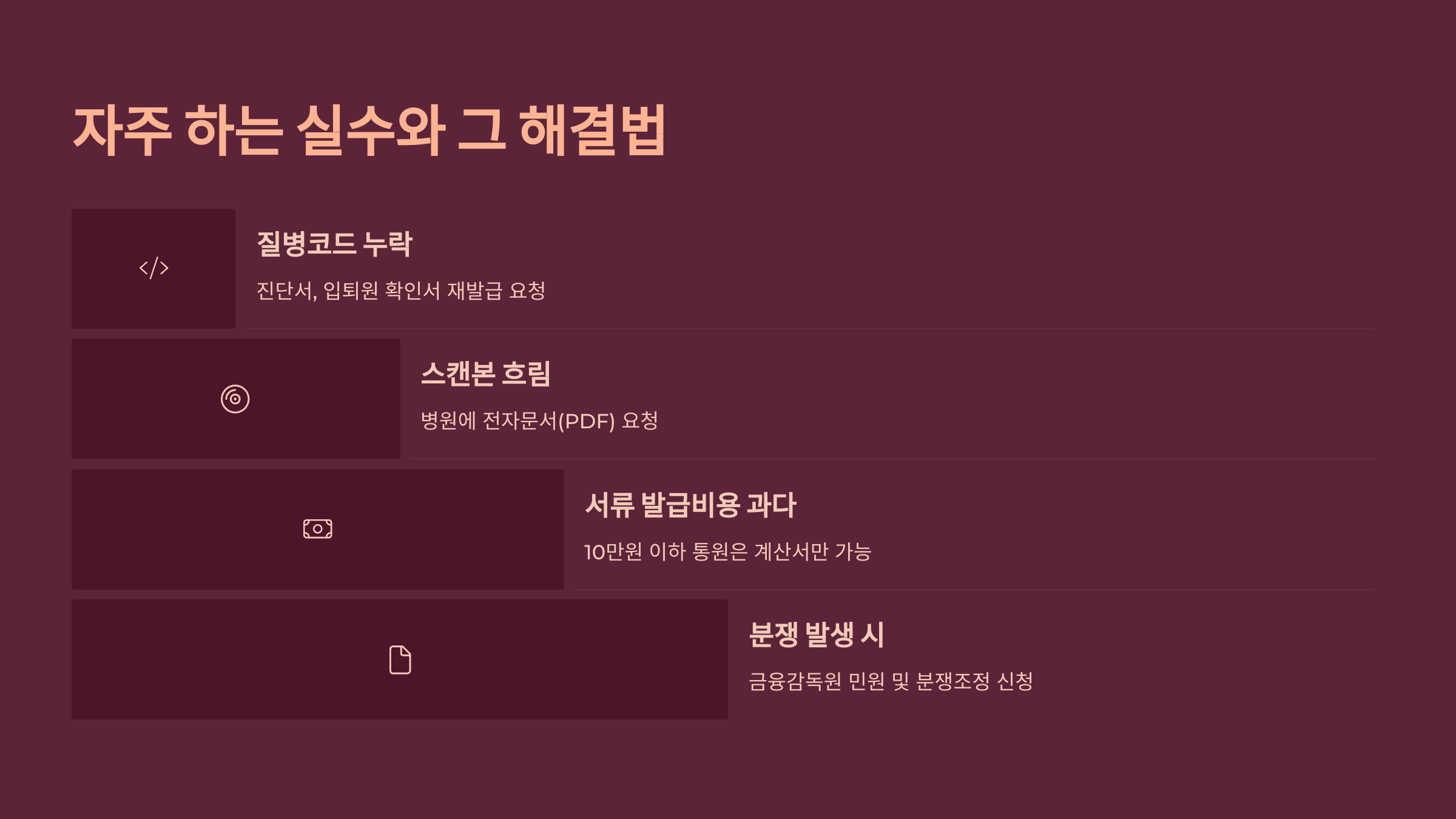 - 질병코드 누락 → 진단서, 입퇴원 확인서 재발급 요청