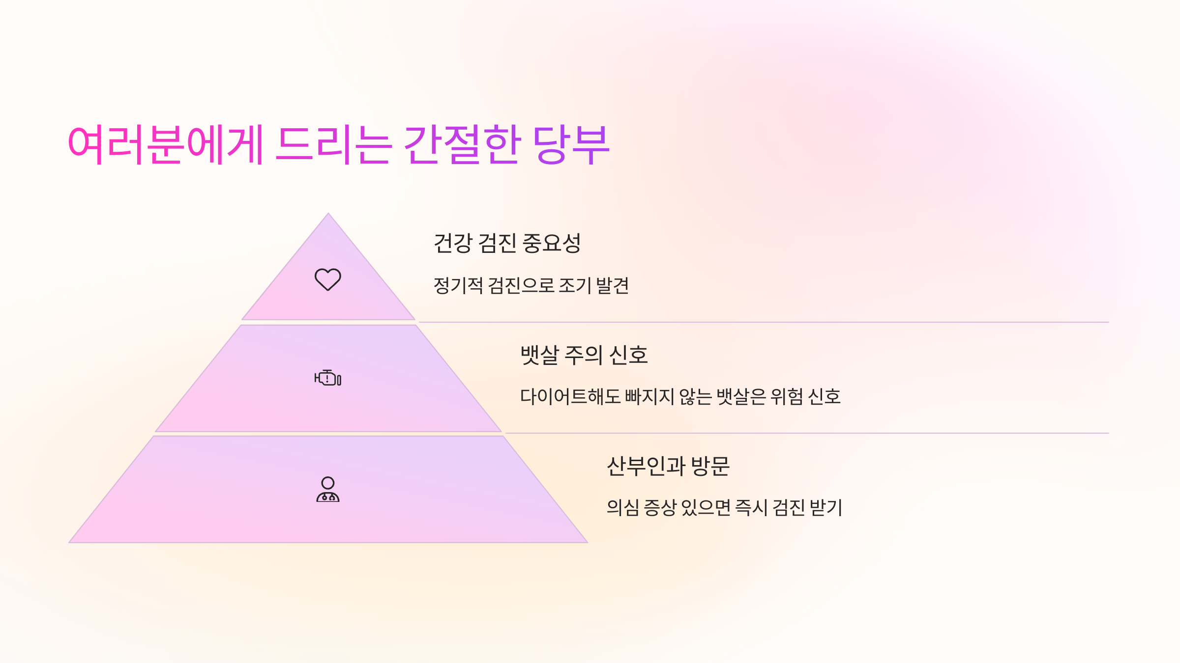 - 신체 변화에 주의를 기울이세요: 갑작스러운 복부 팽만, 식욕 감소, 지속적인 소화불량, 빈뇨 등의 증상이 지속된다면 반드시 의사와 상담하세요.