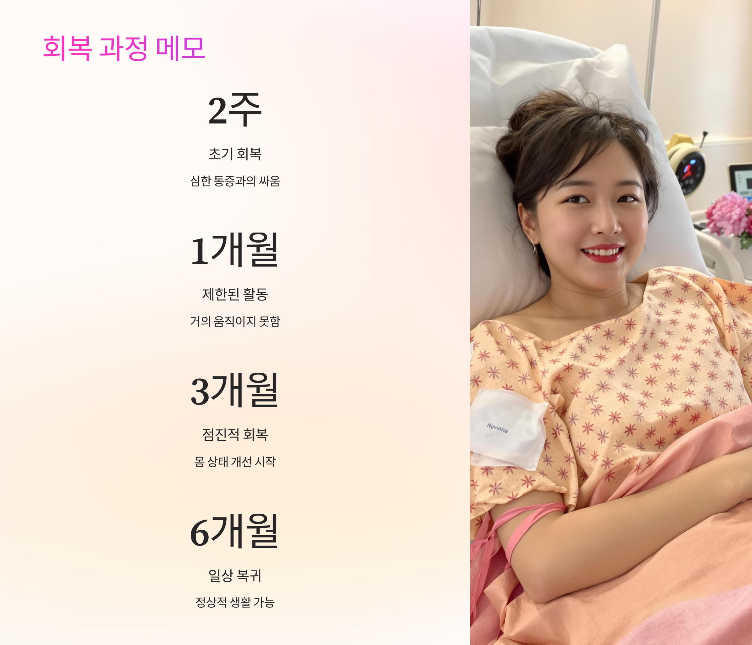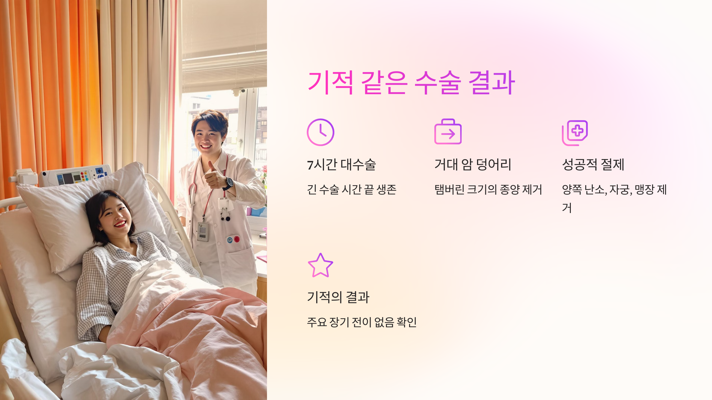7시간의 대수술 끝에 눈을 떴을 때, 가장 먼저 들은 것은 간호사님들의 목소리였습니다. "살았구나" 하는 생각이 들었어요. 정신이 좀 돌아오자 의사 선생님이 오셔서 수술 결과를 알려주셨습니다.