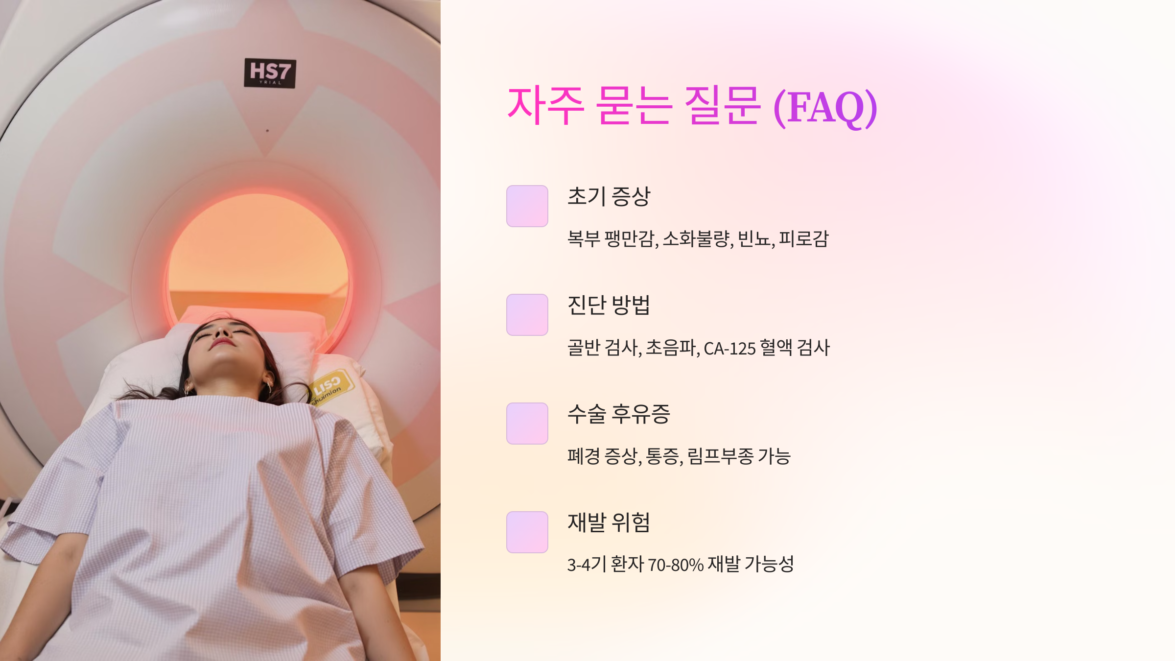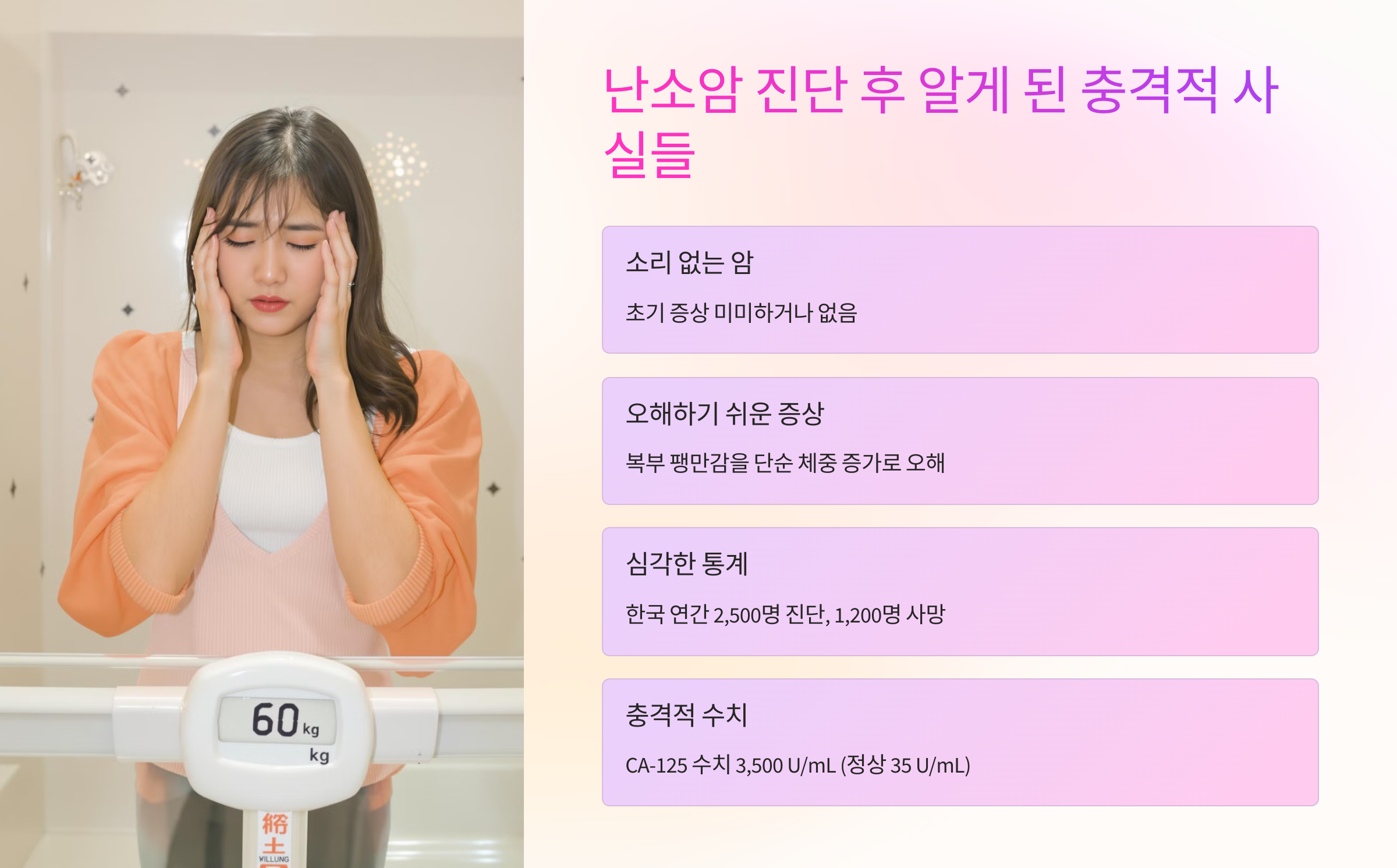 - 난소암은 '소리 없는 암'이라 불리며, 초기 증상이 거의 없거나 미미하다.