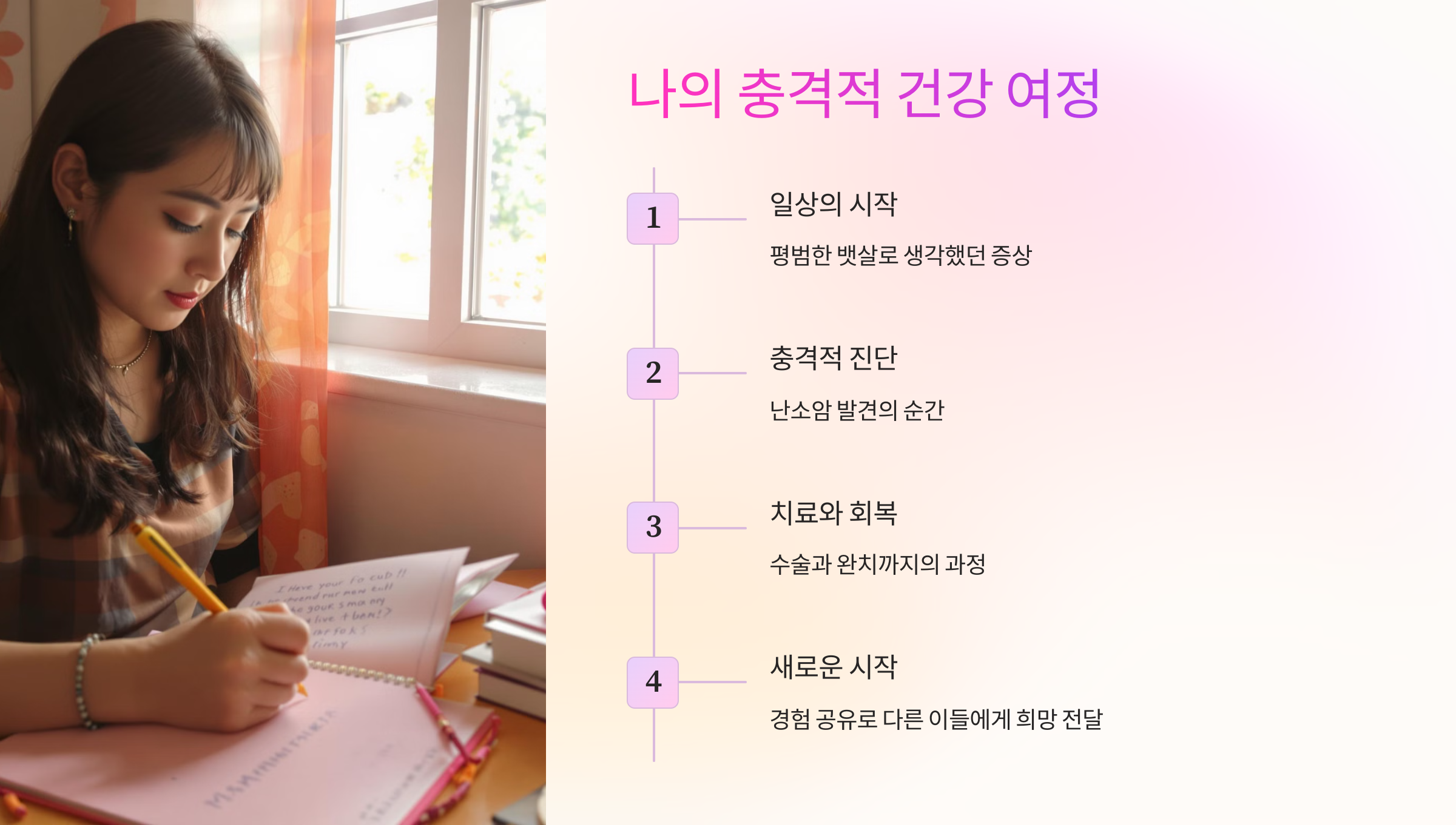 시간이 지나면서 저는 빠르게 회복되었고, 다시 일상으로 돌아왔습니다. 지금은 건강하게 이렇게 제 경험을 나눌 수 있게 되었네요. 제 이야기가 단 한 명의 여성이라도 구할 수 있다면, 저는 이 글을 쓴 보람이 있을 것 같습니다.