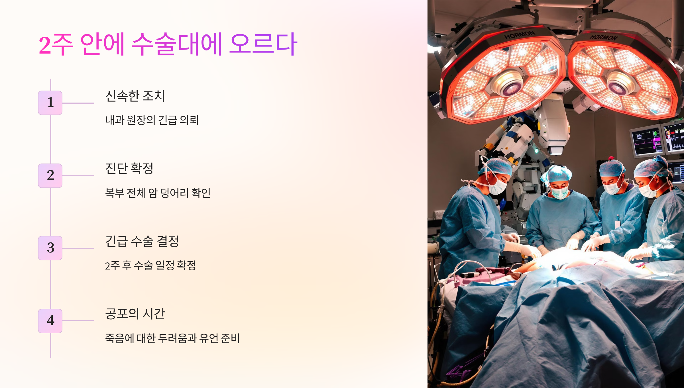 "죽을 수도 있다"는 말이 계속 귓가에 맴돌았고, 두려움에 떨며 수술실에 누웠습니다. 마취약이 들어가고 눈이 감기는 순간, '이게 마지막일까?' 하는 생각이 들었습니다.