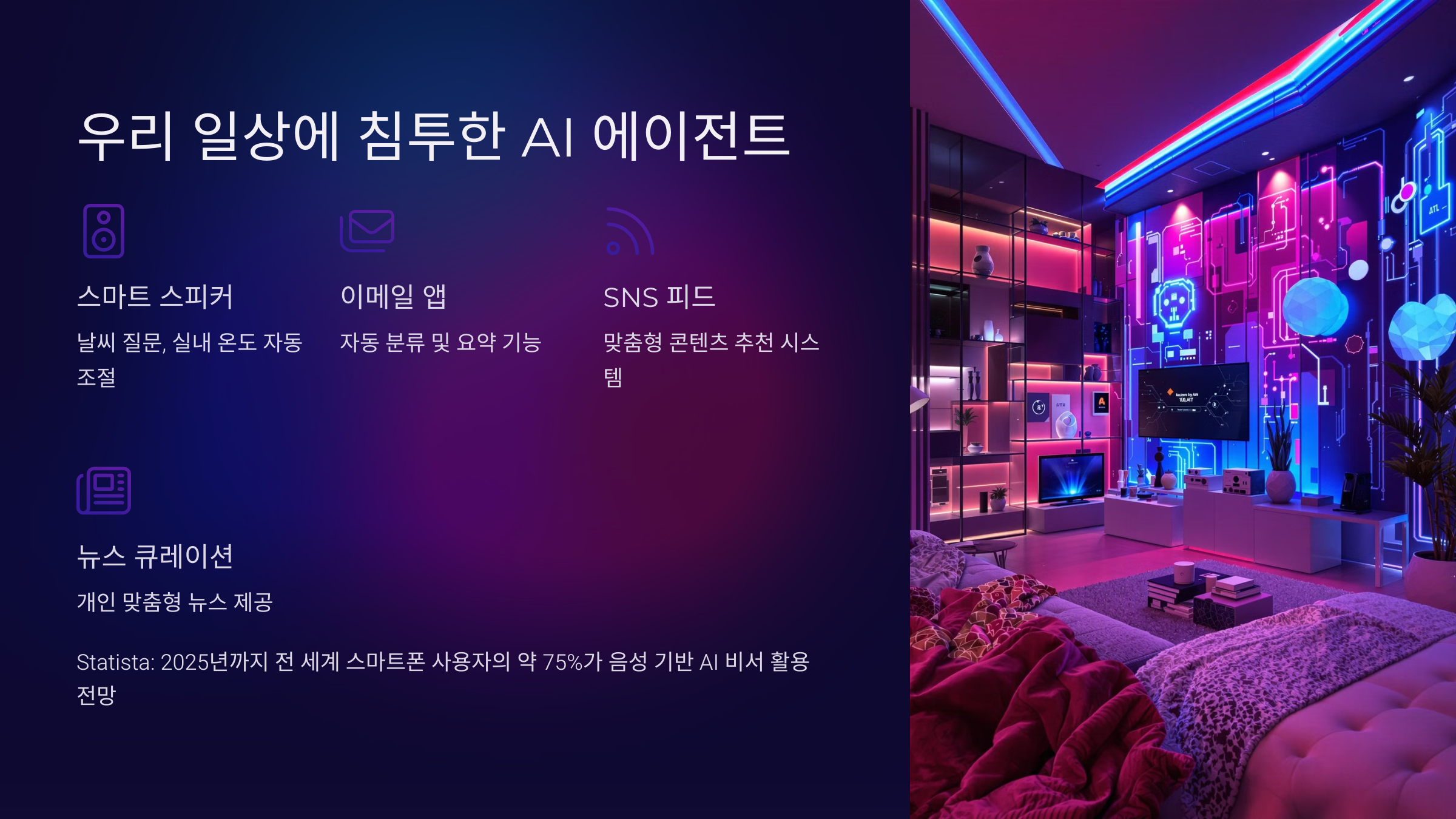 AI 에이전트는 일상 생활에서 점점 더 보편화되고 있습니다. 스마트 스피커의 날씨 정보 제공, 이메일 자동 분류 및 요약 기능, SNS의 맞춤형 콘텐츠 추천 시스템 등 다양한 형태로 AI 에이전트 기술이 활용되고 있습니다.