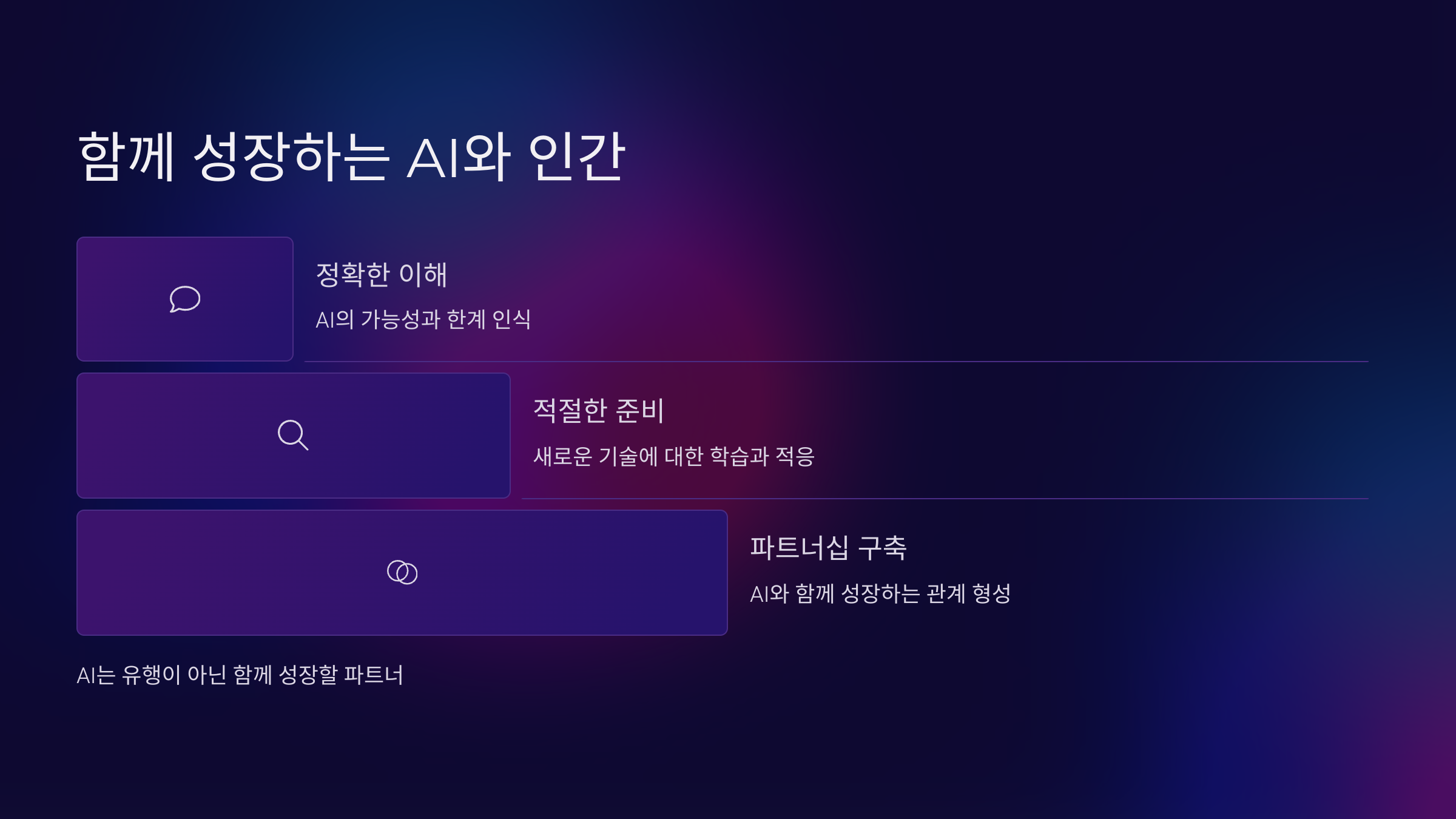 | 창의적 사고 | 데이터 기반의 제한적 창의성 | 직관과 감성을 포함한 고차원적 창의성 |